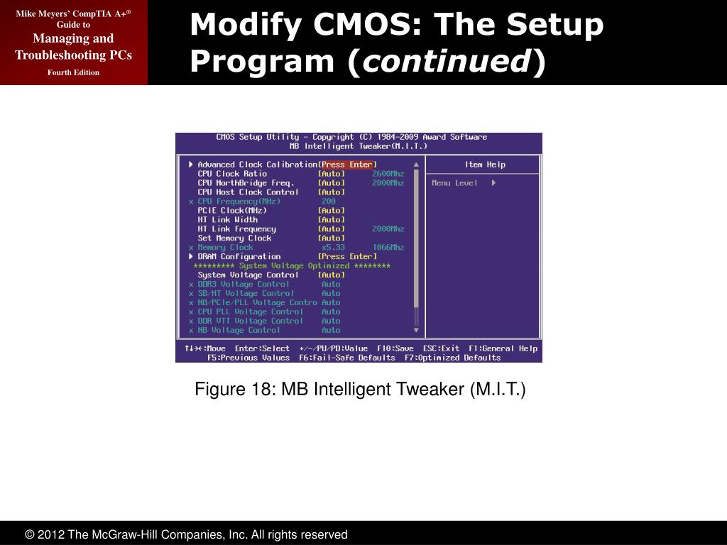 Modify CMOS: The Setup Program (continued) • MB Intelligent Tweaker (M.I.T.): • You can use the MB Intelligent Tweaker (M.I.T.) to change the voltage and multiplier settings on the motherboard for the CPU from the defaults. • Motherboards that cater to overclockers tend to have this option. • Normally, you would keep these settings at AUTO or default.