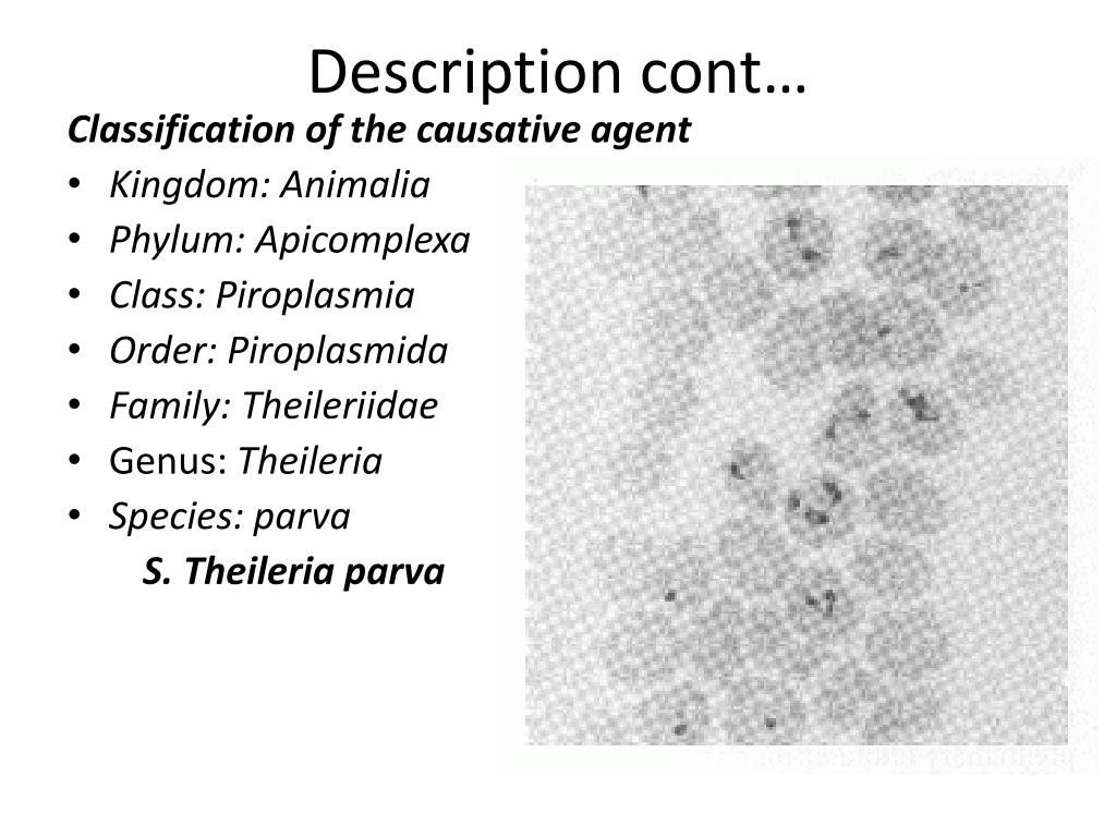 Description cont… Classification of the causative agent • Kingdom: Animalia • Phylum: Apicomplexa • Class: Piroplasmia • Order: Piroplasmida • Family: Theileriidae • Genus: Theileria • Species: parva S. Theileriaparva