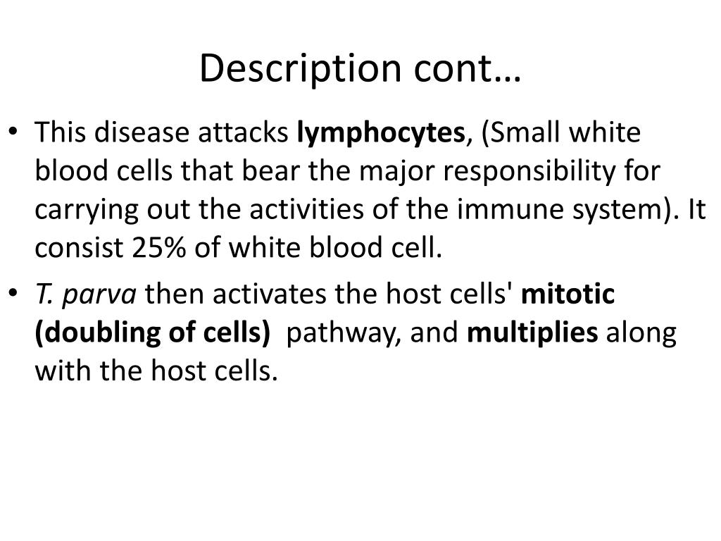 Description cont… • This disease attacks lymphocytes, (Small white blood cells that bear the major responsibility for carrying out the activities of the immune system). It consist 25% of white blood cell. • T. parvathen activates the host cells' mitotic (doubling of cells) pathway, and multiplies along with the host cells.