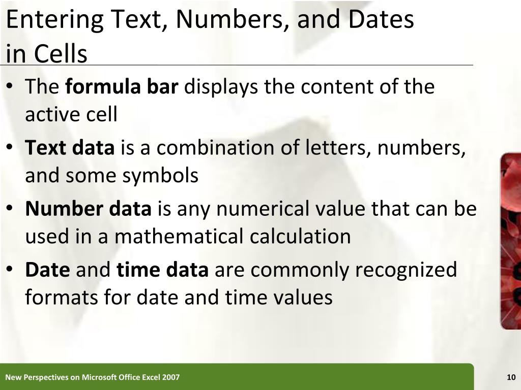 Entering Text, Numbers, and Dates in Cells • The formula bar displays the content of the active cell • Text data is a combination of letters, numbers, and some symbols • Number data is any numerical value that can be used in a mathematical calculation • Date and time data are commonly recognized formats for date and time values New Perspectives on Microsoft Office Excel 2007