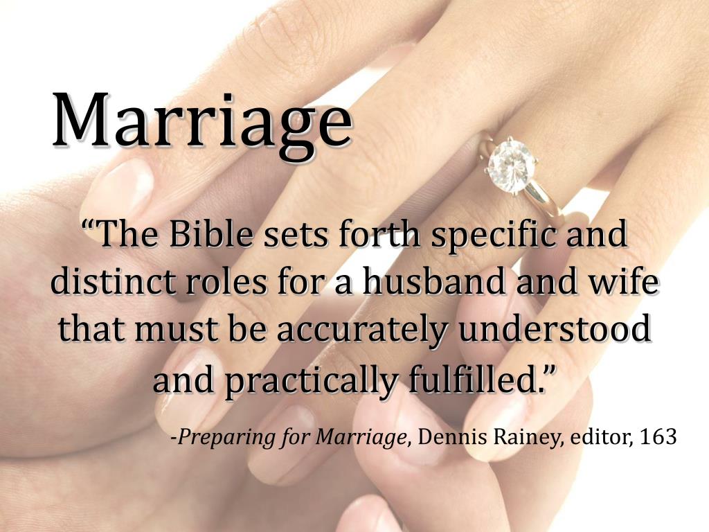Marriage “The Bible sets forth specific and distinct roles for a husband and wife that must be accurately understood and practically fulfilled.” -Preparing for Marriage, Dennis Rainey, editor, 163