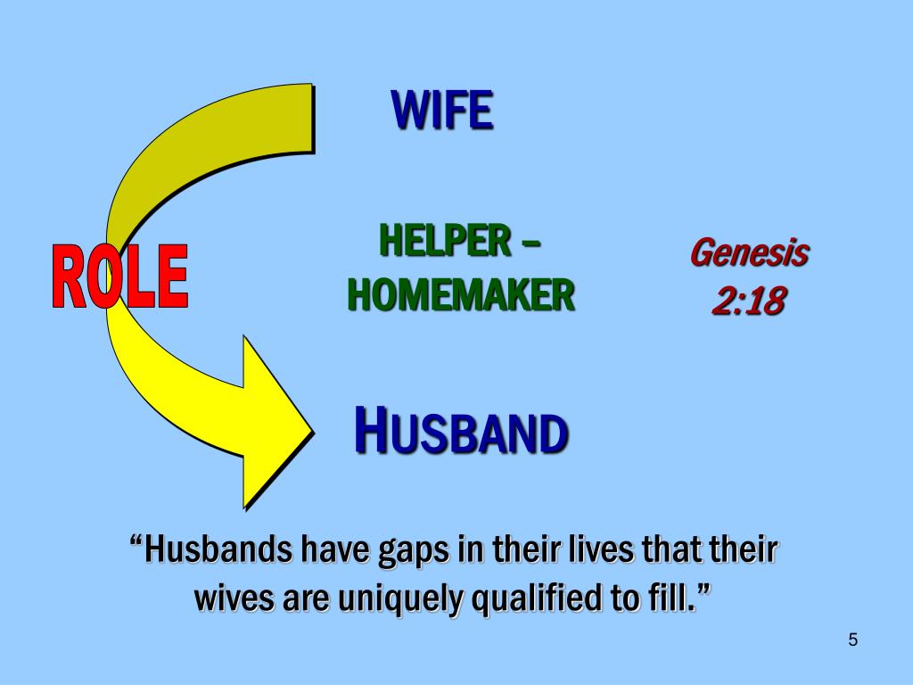 WIFE HELPER – HOMEMAKER Genesis 2:18 ROLE HUSBAND “Husbands have gaps in their lives that their wives are uniquely qualified to fill.”