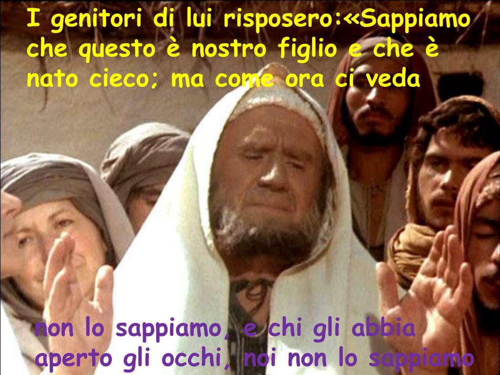I genitori di lui risposero:«Sappiamo che questo è nostro figlio e che è nato cieco; ma come ora ci veda non lo sappiamo, e chi gli abbia aperto gli occhi, noi non lo sappiamo