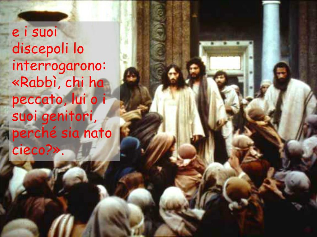 e i suoi discepoli lo interrogarono: «Rabbì, chi ha peccato, lui o i suoi genitori, perché sia nato cieco?».