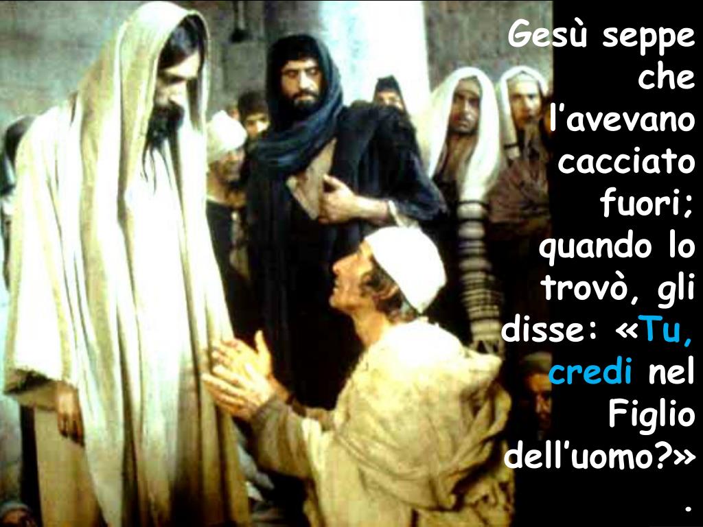 Gesù seppe che l’avevano cacciato fuori; quando lo trovò, gli disse: «Tu, credi nel Figlio dell’uomo?».