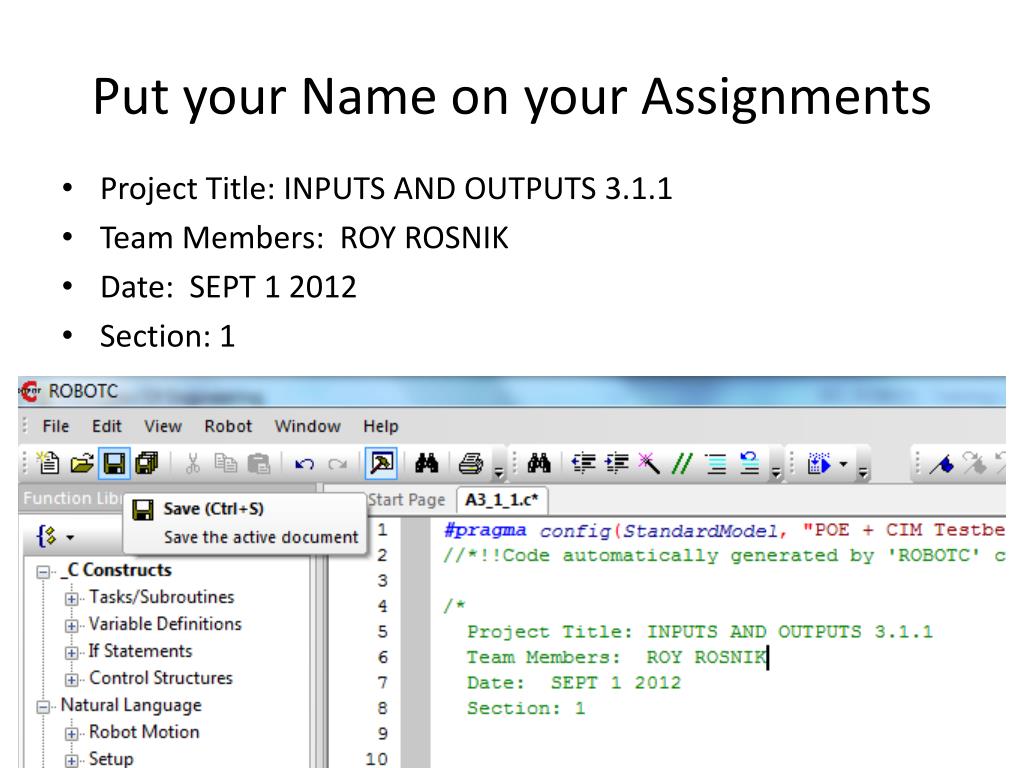 Put your Name on your Assignments • Project Title: INPUTS AND OUTPUTS 3.1.1 • Team Members: ROY ROSNIK • Date: SEPT 1 2012 • Section: 1