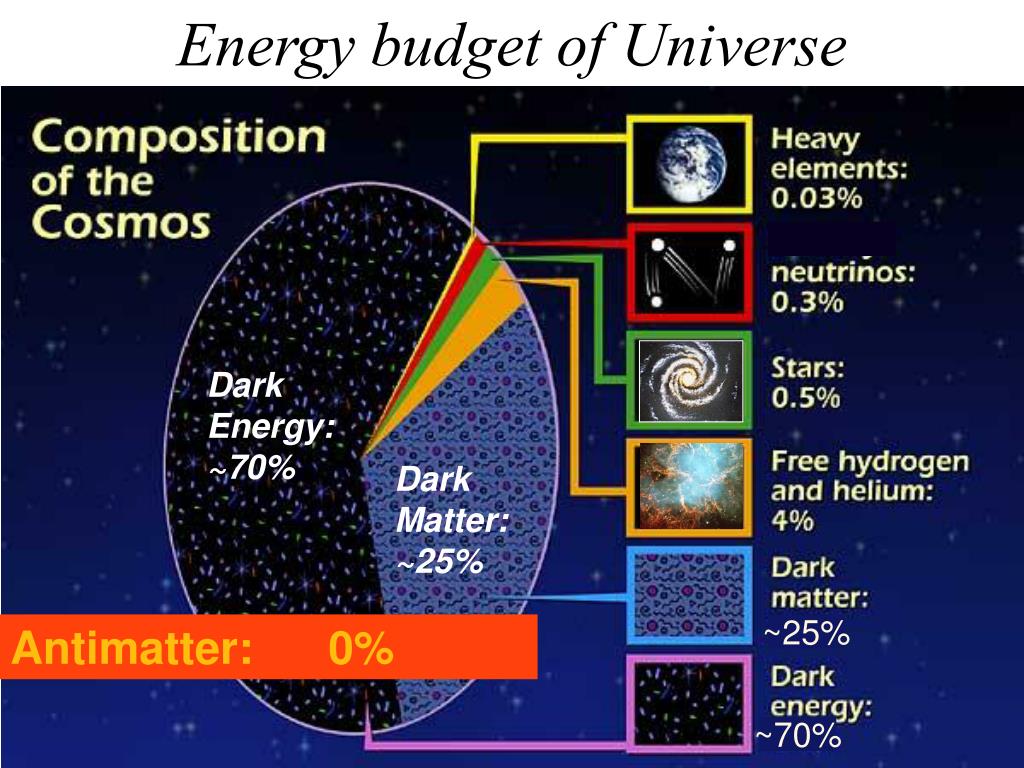 Energy budget of Universe Dark Energy: ~70% Dark Matter: ~25% Antimatter: 0% ~25% ~70%