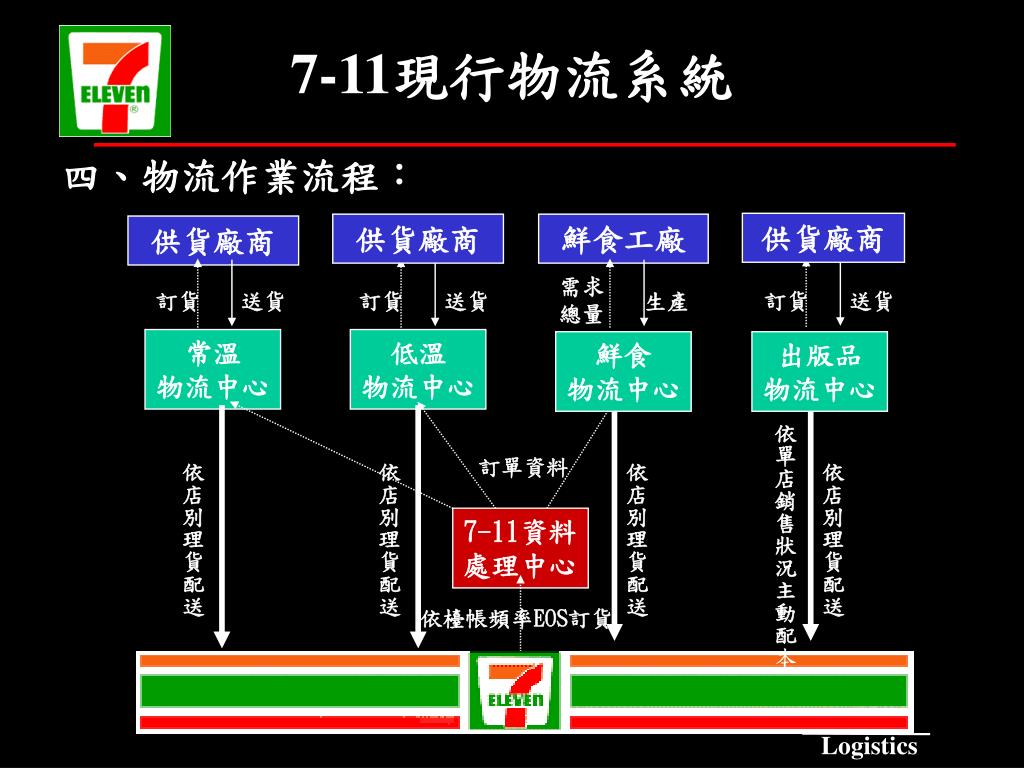 供貨廠商 供貨廠商 鮮食工廠 供貨廠商 需求總量 訂貨 送貨 訂貨 送貨 訂貨 送貨 生產 常溫物流中心 低溫物流中心 鮮食物流中心 出版品物流中心 依單店銷售狀況主動配本 訂單資料 依店別理貨配送 依店別理貨配送 依店別理貨配送 依店別理貨配送 7-11資料處理中心 依檯帳頻率EOS訂貨 7-11現行物流系統 四、物流作業流程: