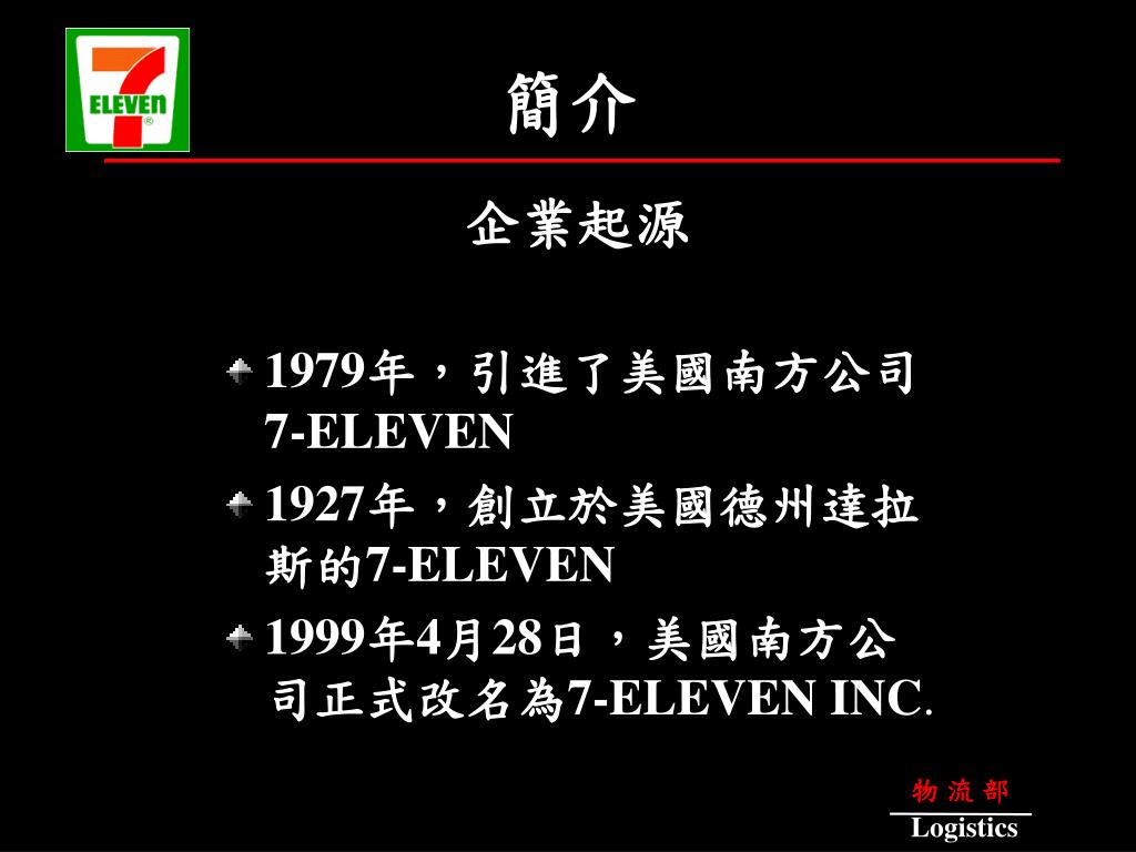 簡介 企業起源 • 1979年,引進了美國南方公司7-ELEVEN • 1927年,創立於美國德州達拉斯的7-ELEVEN • 1999年4月28日,美國南方公司正式改名為7-ELEVEN INC.