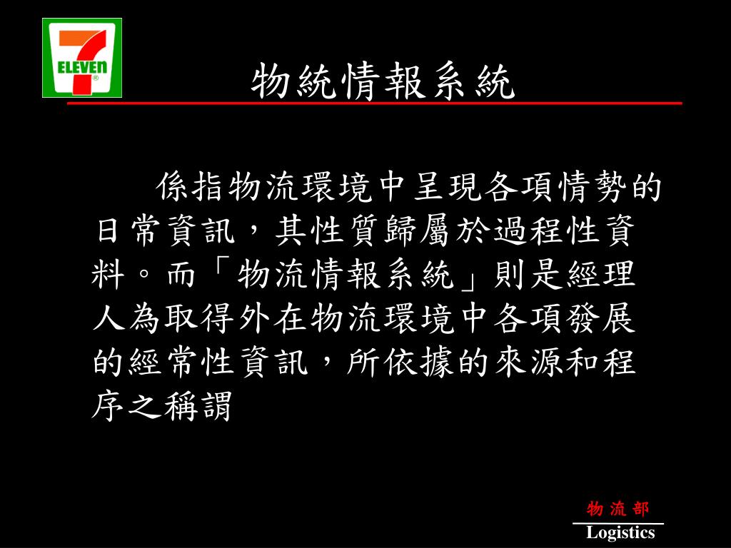 7-11現行物流系統 五、EOS(電子訂貨系統)網路架構 電話網路 一般加值網路 7-11門市 NON-EDI供應商 電話網路 資料處理中心PIC EDIVAN 7-11門市 EDI供應商 民間VAN 電話(FAX)網路 FAX供應商 VAN CENTER(PIC) 7-11 供貨商 資料輸入資料處理EOS 處理資料傳遞資料接收 訂貨 訂退貨 主檔維護 訂退貨資料 撿貨 退貨 主檔下傳 派車 業績 主檔更新 統計分析 供貨資料 送貨 、 訂貨管理 、 、 檯帳管理 、 、 配送管理 驗收資料 、 網路管理 訂貨稽催