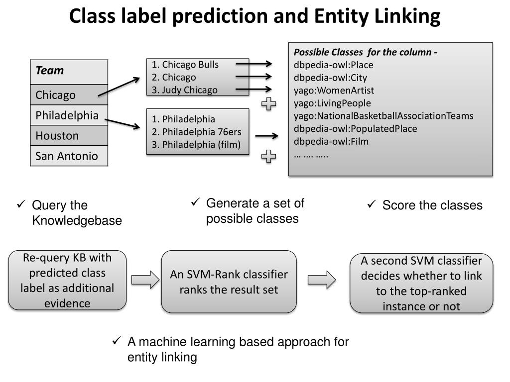 Class label prediction and Entity Linking Possible Classes for the column - dbpedia-owl:Place dbpedia-owl:City yago:WomenArtist yago:LivingPeople yago:NationalBasketballAssociationTeams dbpedia-owl:PopulatedPlace dbpedia-owl:Film… …. ….. 1. Chicago Bulls 2. Chicago 3. Judy Chicago 1. Philadelphia 2. Philadelphia 76ers 3. Philadelphia (film) • Generate a set of possible classes • Query the Knowledgebase • Score the classes Re-query KB with predicted class label as additional evidence An SVM-Rank classifier ranks the result set A second SVM classifier decides whether to link to the top-ranked instance or not • A machine learning based approach for entity linking