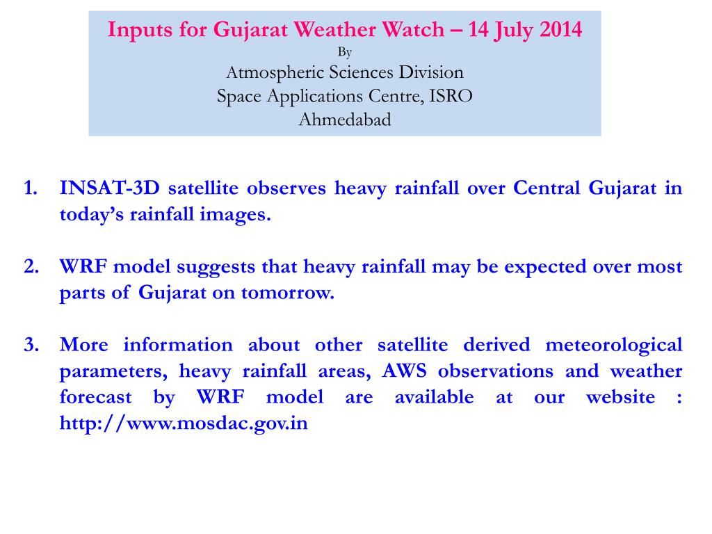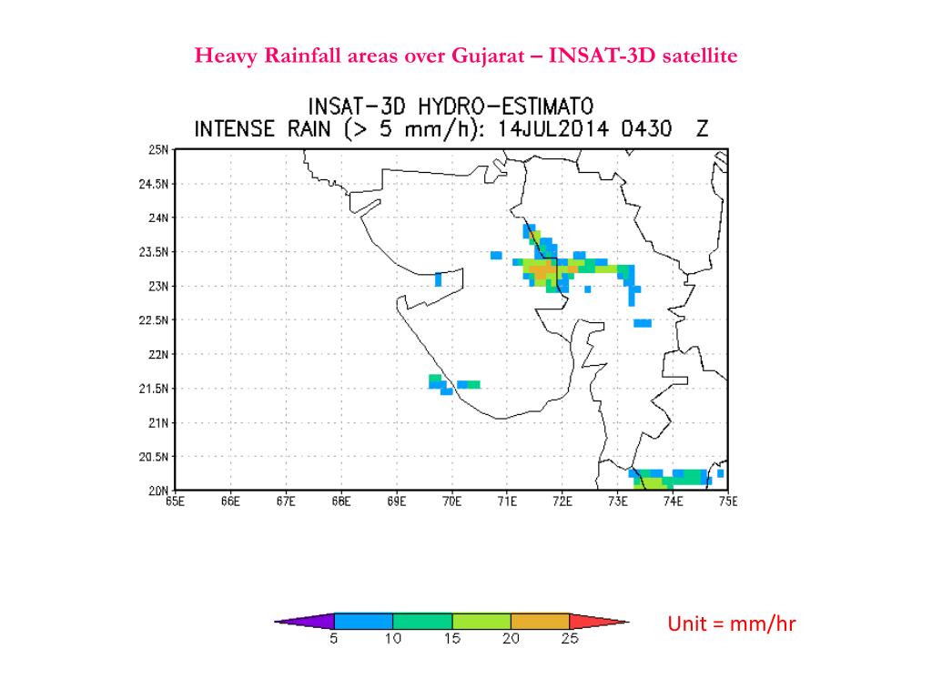 Inputs for Gujarat Weather Watch – 14 July 2014 By A tmospheric Sciences Division Space Applications Centre, ISRO Ahmedabad. INSAT-3D satellite observes heavy rainfall over Central Gujarat in today’s rainfall images.