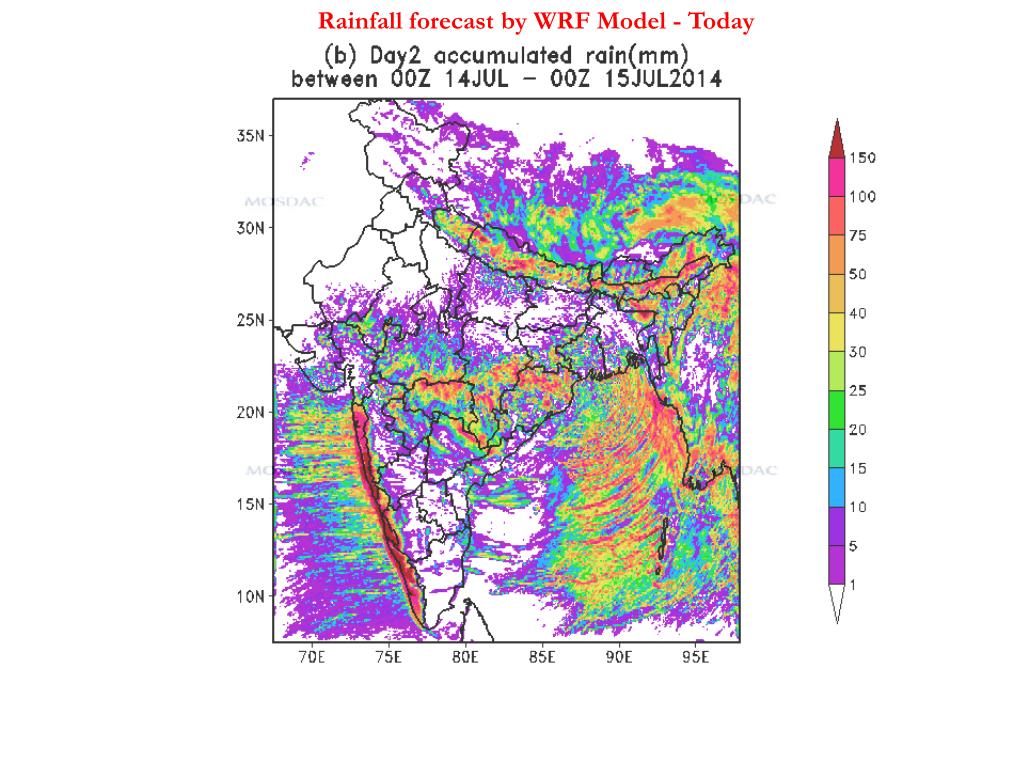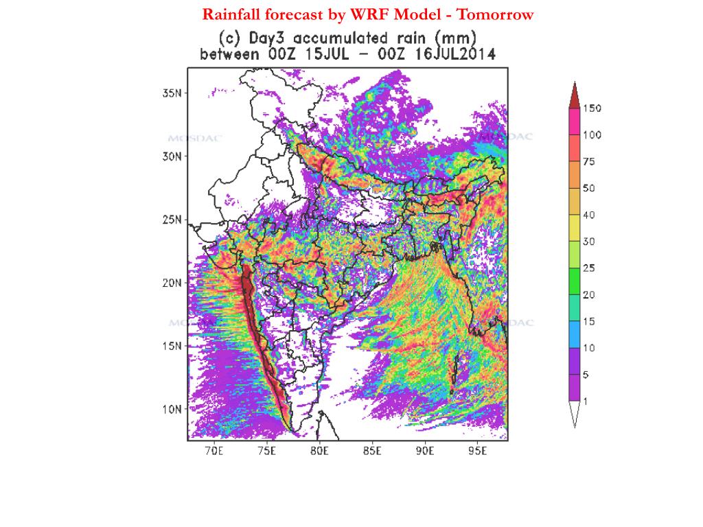 INSAT-3D Satellite observes heavy rainfall over the following districts of Gujarat on 14 July 2014 at 0945 AM: These districts and rainfall rates are as follows: • WRF model forecast suggests that heavy rainfall may be expected over most parts of Gujarat state (excluding Kutchh) on tomorrow – Model forecasts included.