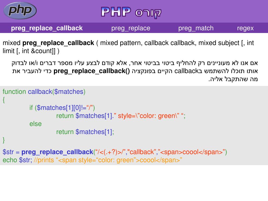 קורס PHP preg_replace_callback preg_replace preg_match regex mixed preg_replace_callback ( mixed pattern, callback callback, mixed subject [, int limit [, int &count]] ) אם אנו לא מעוניינים רק להחליף ביטוי בביטוי אחר, אלא קודם לבצע עליו מספר דברים ו/או לבדוק אותו תוכלו להשתמש בcallback הקיים בפונקציה preg_replace_callback()כדי להעביר את מה שהתקבל אליה. function callback($matches){if ($matches[1][0]!=“/”)return $matches[1].” style=\”color: green\” “;elsereturn $matches[1];} $str = preg_replace_callback(“/<(.+?)>/”,"callback”,”<span>coool</span>”)echo$str;//prints “<span style=“color: green”>coool</span>”