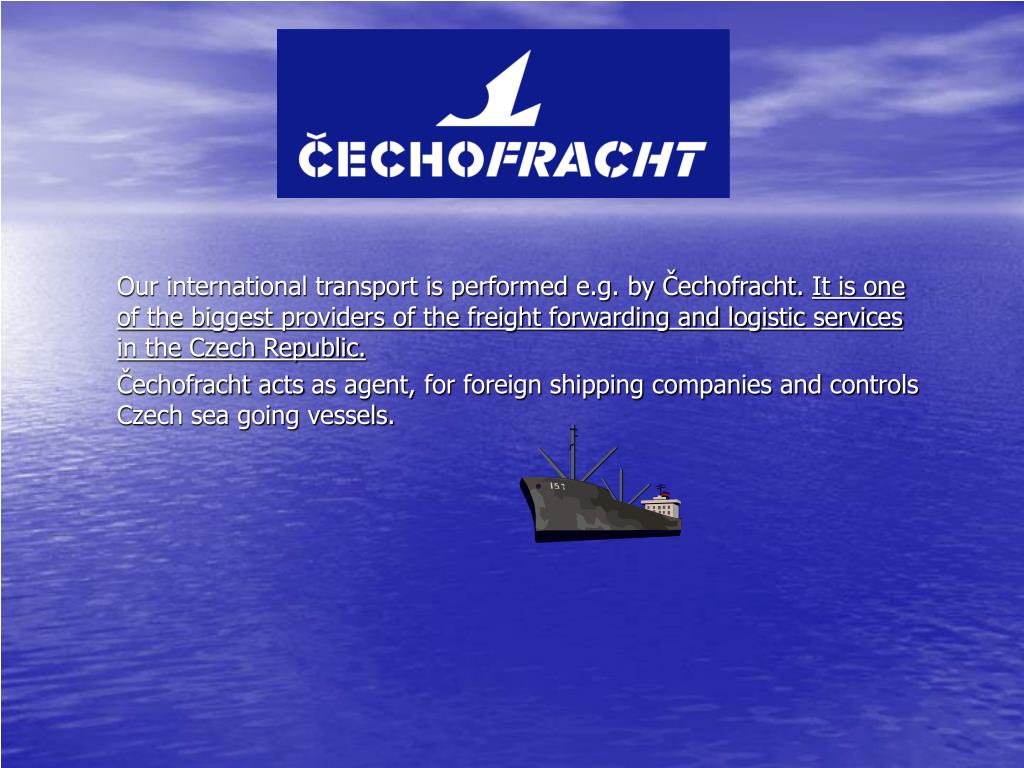 Our international transport is performed e.g. by Čechofracht.It is one of the biggest providers of the freight forwarding and logistic services in the Czech Republic. Čechofracht acts as agent, for foreign shipping companies and controls Czech sea going vessels.