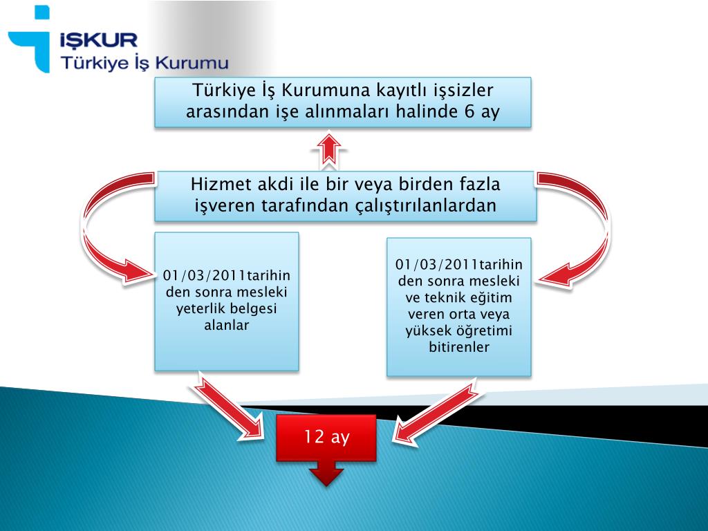 Türkiye İş Kurumuna kayıtlı işsizler arasından işe alınmaları halinde 6 ay Hizmet akdi ile bir veya birden fazla işveren tarafından çalıştırılanlardan 01/03/2011tarihinden sonra mesleki yeterlik belgesi alanlar 01/03/2011tarihinden sonra mesleki ve teknik eğitim veren orta veya yüksek öğretimi bitirenler 12 ay