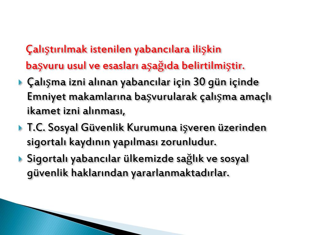 Çalıştırılmak istenilen yabancılara ilişkin başvuru usul ve esasları aşağıda belirtilmiştir. • Çalışma izni alınan yabancılar için 30 gün içinde Emniyet makamlarına başvurularak çalışma amaçlı ikamet izni alınması, • T.C. Sosyal Güvenlik Kurumuna işveren üzerinden sigortalı kaydının yapılması zorunludur. • Sigortalı yabancılar ülkemizde sağlık ve sosyal güvenlik haklarından yararlanmaktadırlar.