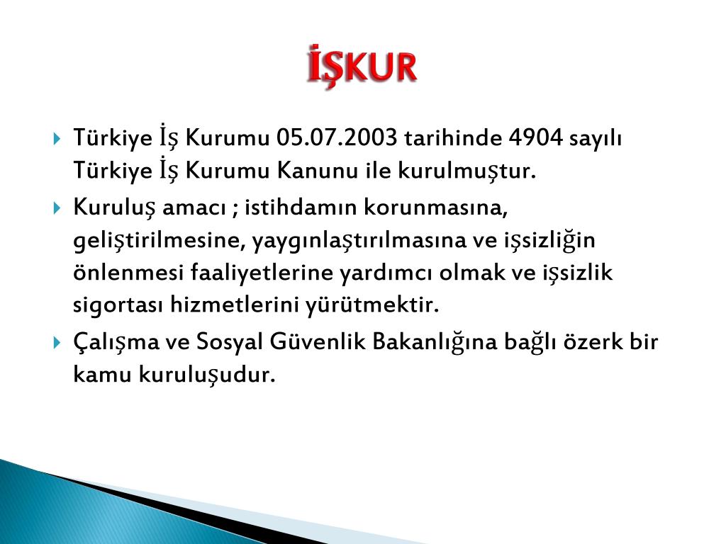 İŞKUR • Türkiye İş Kurumu 05.07.2003 tarihinde 4904 sayılı Türkiye İş Kurumu Kanunu ile kurulmuştur. • Kuruluş amacı ; istihdamın korunmasına, geliştirilmesine, yaygınlaştırılmasına ve işsizliğin önlenmesi faaliyetlerine yardımcı olmak ve işsizlik sigortası hizmetlerini yürütmektir. • Çalışma ve Sosyal Güvenlik Bakanlığına bağlı özerk bir kamu kuruluşudur.