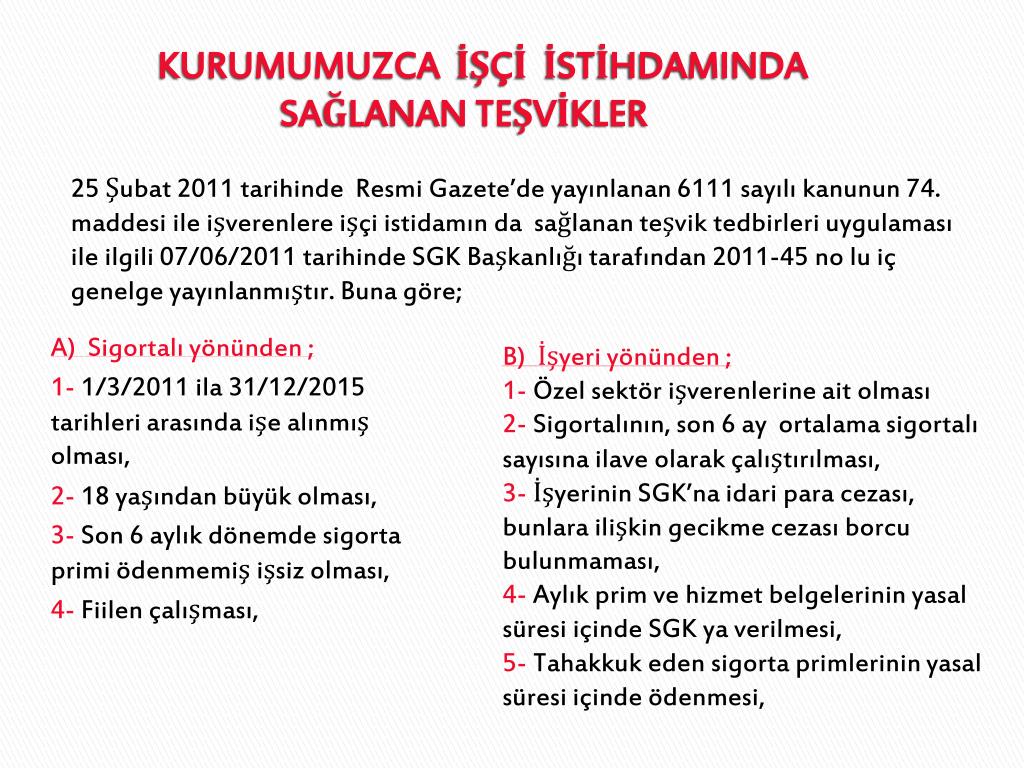 KURUMUMUZCA İŞÇİ İSTİHDAMINDA SAĞLANAN TEŞVİKLER A) Sigortalı yönünden ; 1- 1/3/2011 ila 31/12/2015 tarihleri arasında işe alınmış olması, 2- 18 yaşından büyük olması, 3- Son 6 aylık dönemde sigorta primi ödenmemiş işsiz olması, 4- Fiilen çalışması, B) İşyeri yönünden ; 1-Özel sektör işverenlerine ait olması 2- Sigortalının, son 6 ay ortalama sigortalı sayısına ilave olarak çalıştırılması, 3- İşyerinin SGK’na idari para cezası, bunlara ilişkin gecikme cezası borcu bulunmaması, 4- Aylık prim ve hizmet belgelerinin yasal süresi içinde SGK ya verilmesi, 5- Tahakkuk eden sigorta primlerinin yasal süresi içinde ödenmesi, 25 Şubat 2011 tarihinde Resmi Gazete’de yayınlanan 6111 sayılı kanunun 74. maddesi ile işverenlere işçi istidamın da sağlanan teşvik tedbirleri uygulaması ile ilgili 07/06/2011 tarihinde SGK Başkanlığı tarafından 2011-45 nolu iç genelge yayınlanmıştır. Buna göre;