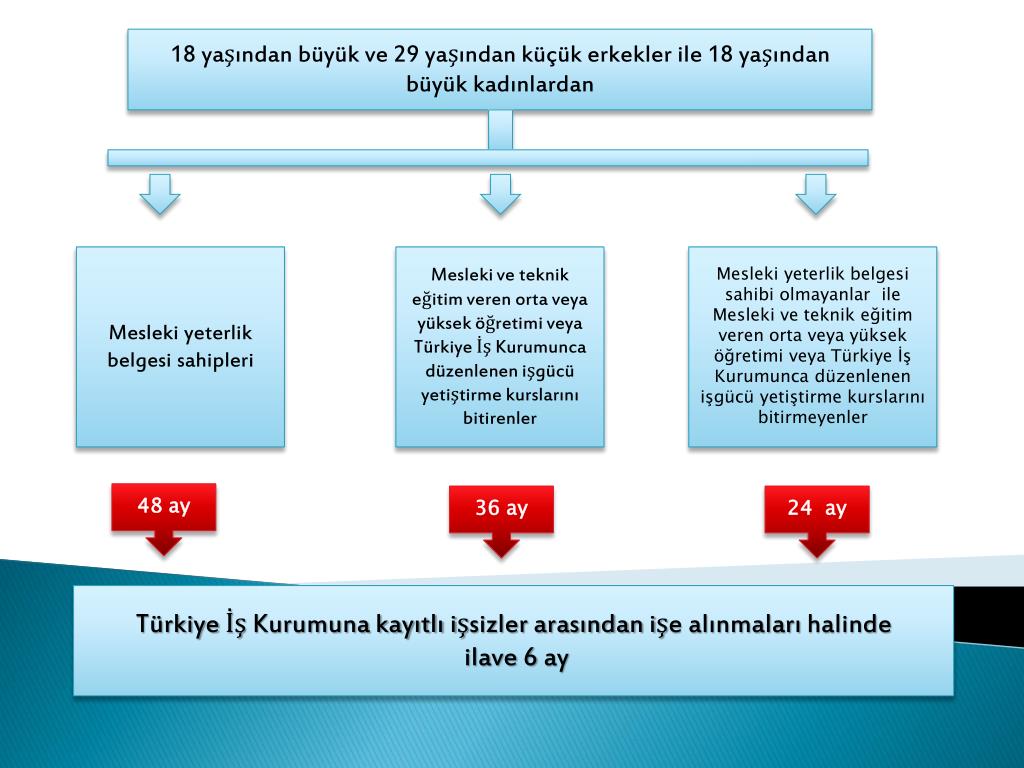 18 yaşından büyük ve 29 yaşından küçük erkekler ile 18 yaşından büyük kadınlardan Mesleki yeterlik belgesi sahipleri Mesleki ve teknik eğitim veren orta veya yüksek öğretimi veya Türkiye İş Kurumunca düzenlenen işgücü yetiştirme kurslarını bitirenler Mesleki yeterlik belgesi sahibi olmayanlar ile Mesleki ve teknik eğitim veren orta veya yüksek öğretimi veya Türkiye İş Kurumunca düzenlenen işgücü yetiştirme kurslarını bitirmeyenler 48 ay 36 ay 24 ay Türkiye İş Kurumuna kayıtlı işsizler arasından işe alınmaları halinde ilave 6 ay