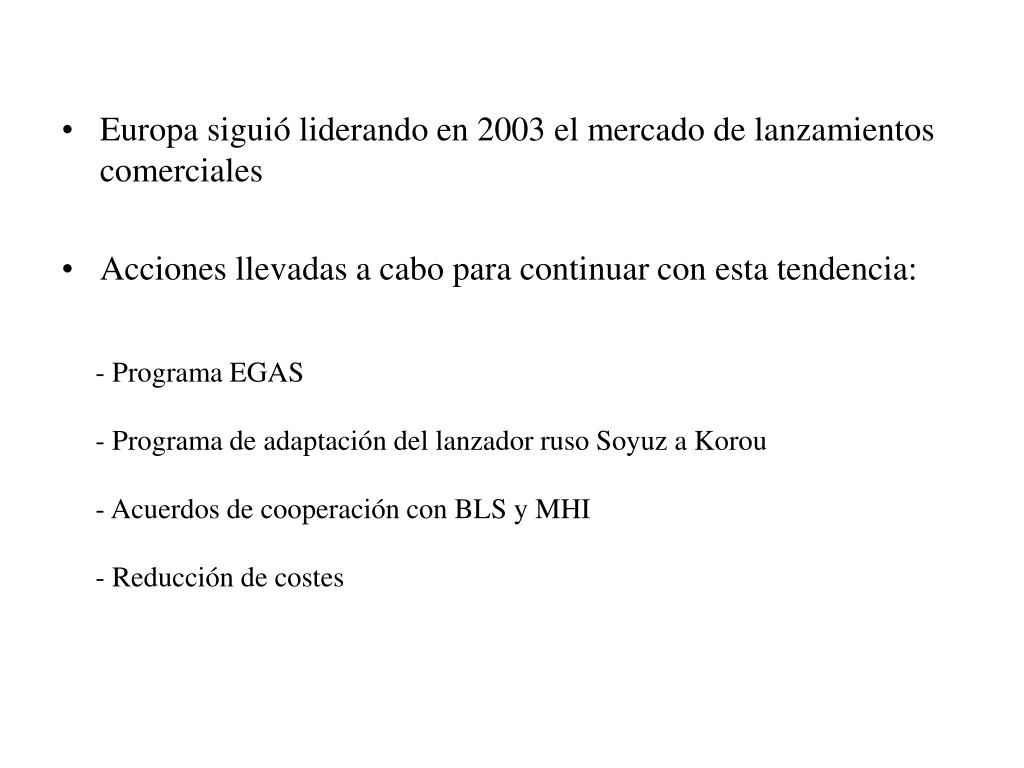 Programa EGAS- Programa de adaptación del lanzador ruso Soyuz a Korou- Acuerdos de cooperación con BLS y MHI- Reducción de costes • Europa siguió liderando en 2003 el mercado de lanzamientos comerciales • Acciones llevadas a cabo para continuar con esta tendencia: