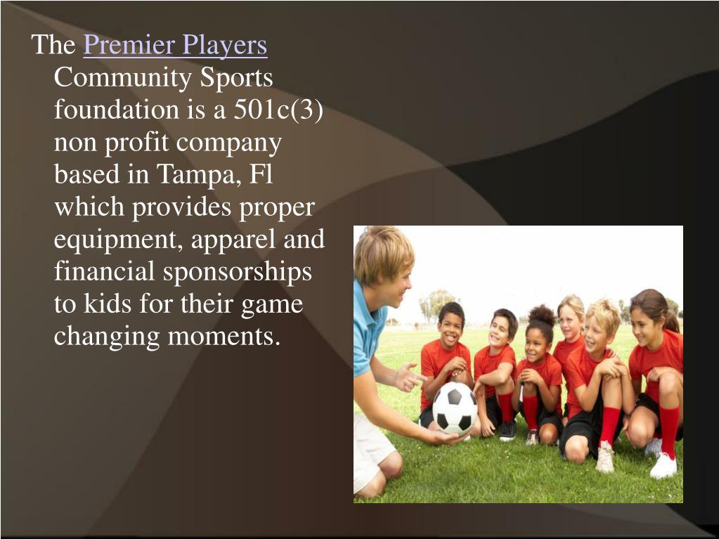 The Premier Players Community Sports foundation is a 501c(3) non profit company based in Tampa, Fl which provides proper equipment, apparel and financial sponsorships to kids for their game changing moments.