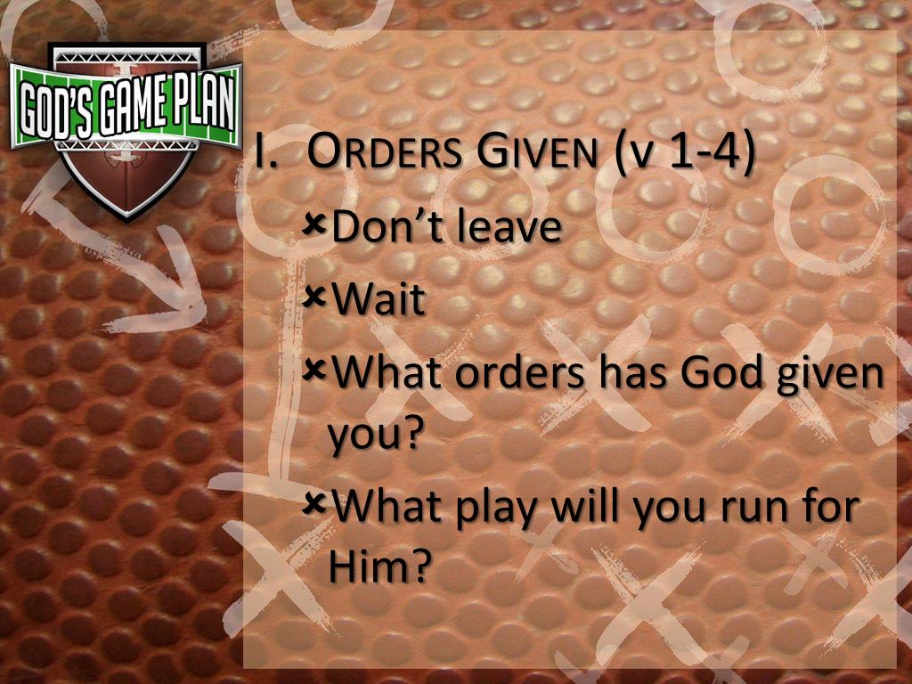 I. ORDERS GIVEN(v 1-4) • Don’t leave • Wait • What orders has God given you? • What play will you run for Him?
