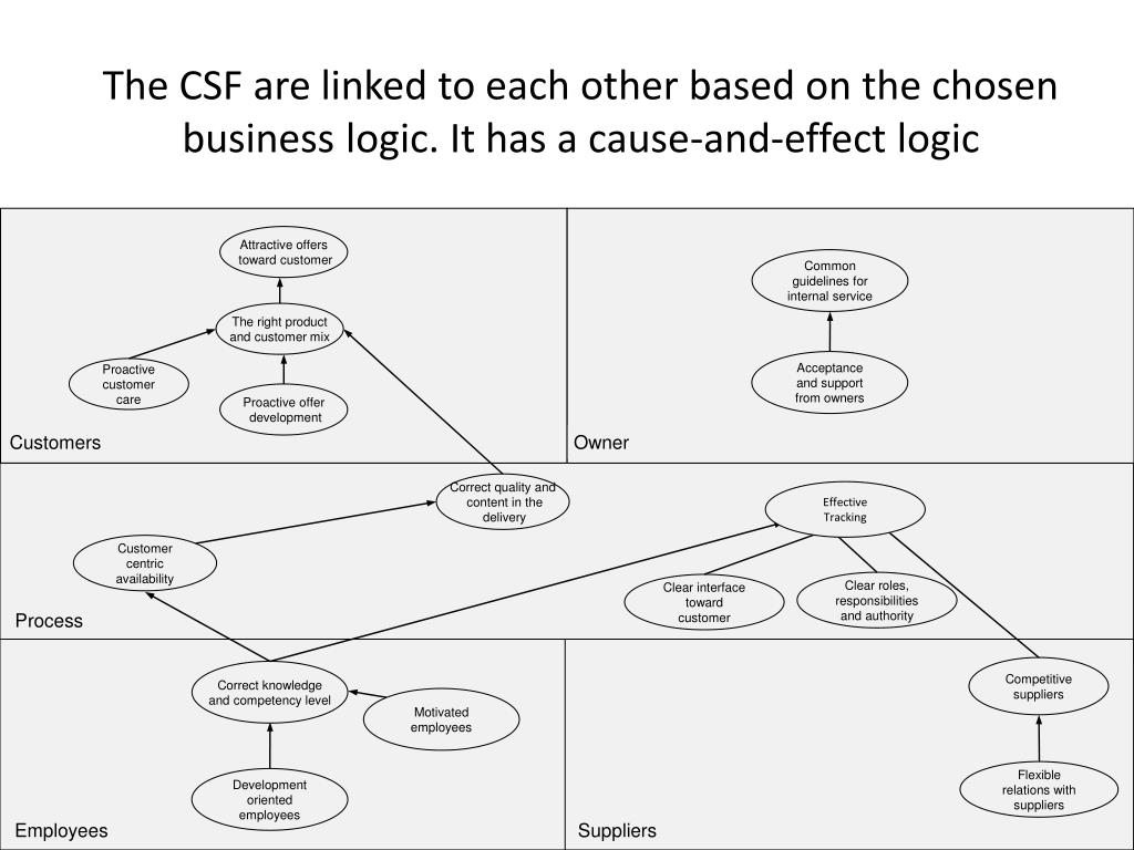 The right productand customer mix Acceptance and support from owners Proactive customer care Proactive offer development Correct quality and content in the delivery Customer centric availability Clear roles, responsibilities and authority Clear interface toward customer Competitive suppliers Correct knowledgeand competency level Motivated employees Flexible relations with suppliers Development oriented employees The CSF are linked to each other based on the chosen business logic. It has a cause-and-effect logic Attractive offers toward customer Common guidelines for internal service Customers Owner Effective Tracking Process Employees Suppliers