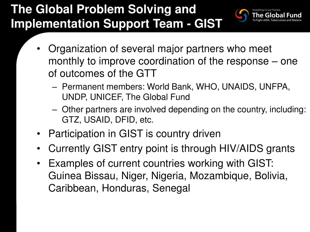 The Global Problem Solving and Implementation Support Team - GIST • Organization of several major partners who meet monthly to improve coordination of the response – one of outcomes of the GTT • Permanent members: World Bank, WHO, UNAIDS, UNFPA, UNDP, UNICEF, The Global Fund • Other partners are involved depending on the country, including: GTZ, USAID, DFID, etc. • Participation in GIST is country driven • Currently GIST entry point is through HIV/AIDS grants • Examples of current countries working with GIST: Guinea Bissau, Niger, Nigeria, Mozambique, Bolivia, Caribbean, Honduras, Senegal