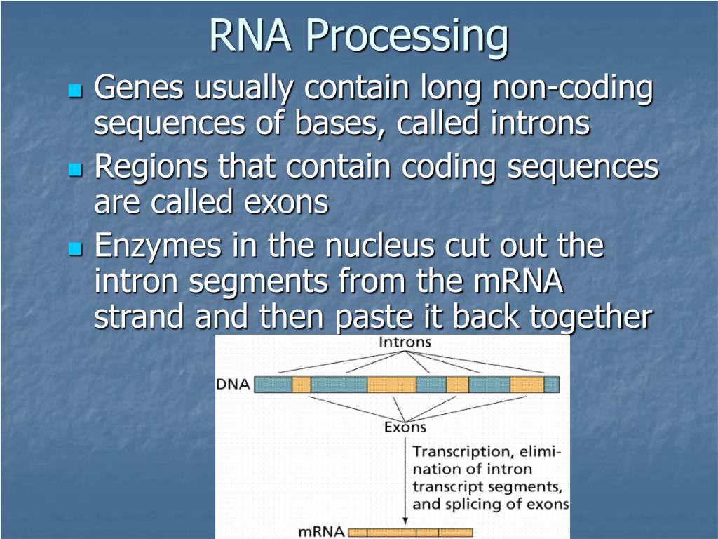 RNA Processing • Genes usually contain long non-coding sequences of bases, called introns • Regions that contain coding sequences are called exons • Enzymes in the nucleus cut out the intron segments from the mRNA strand and then paste it back together