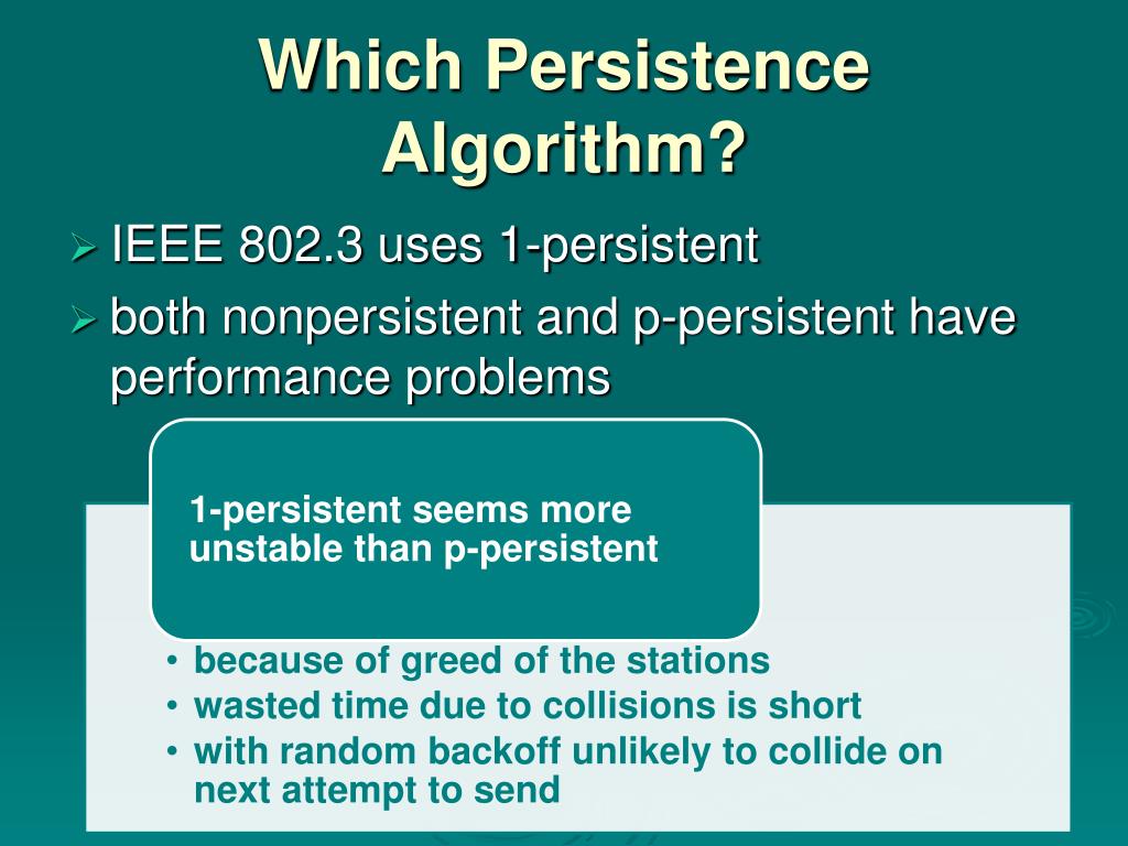 Which Persistence Algorithm? • IEEE 802.3 uses 1-persistent • both nonpersistent and p-persistent have performance problems