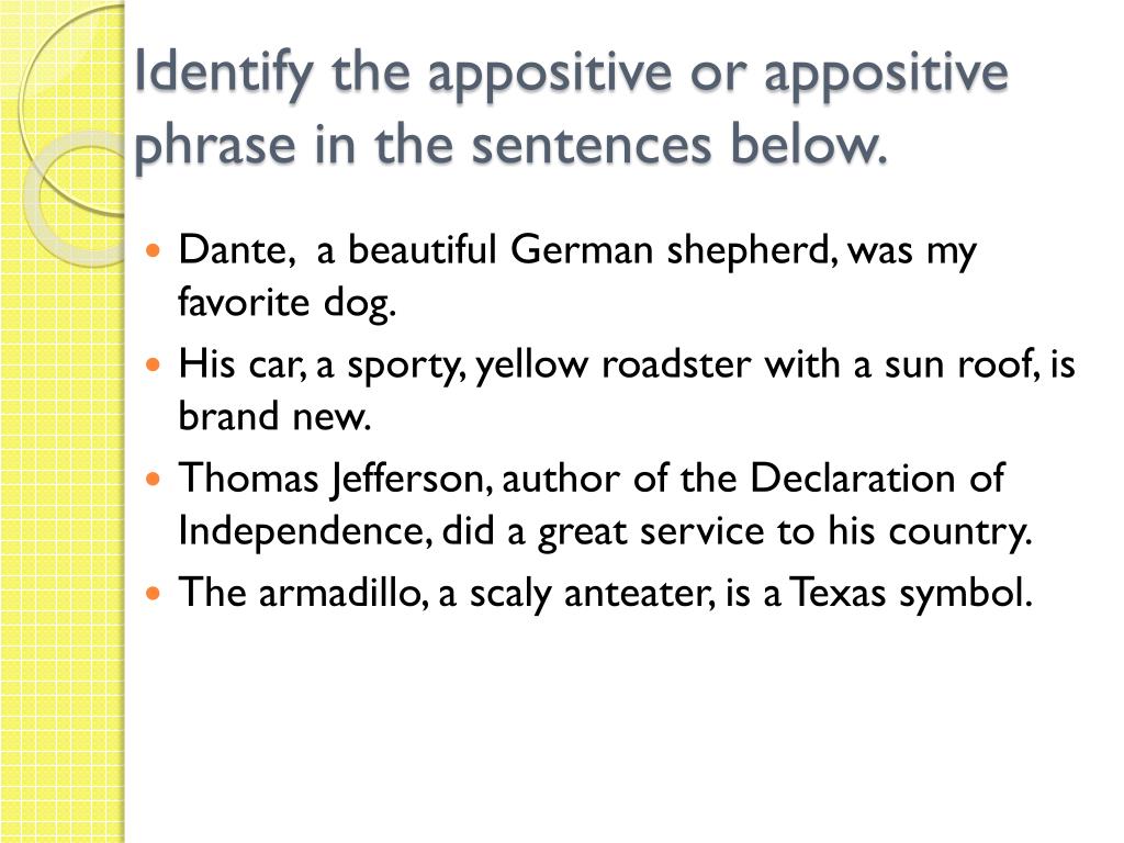 Identify the appositive or appositive phrase in the sentences below. • Dante, a beautiful German shepherd, was my favorite dog. • His car, a sporty, yellow roadster with a sun roof, is brand new. • Thomas Jefferson, author of the Declaration of Independence, did a great service to his country. • The armadillo, a scaly anteater, is a Texas symbol.