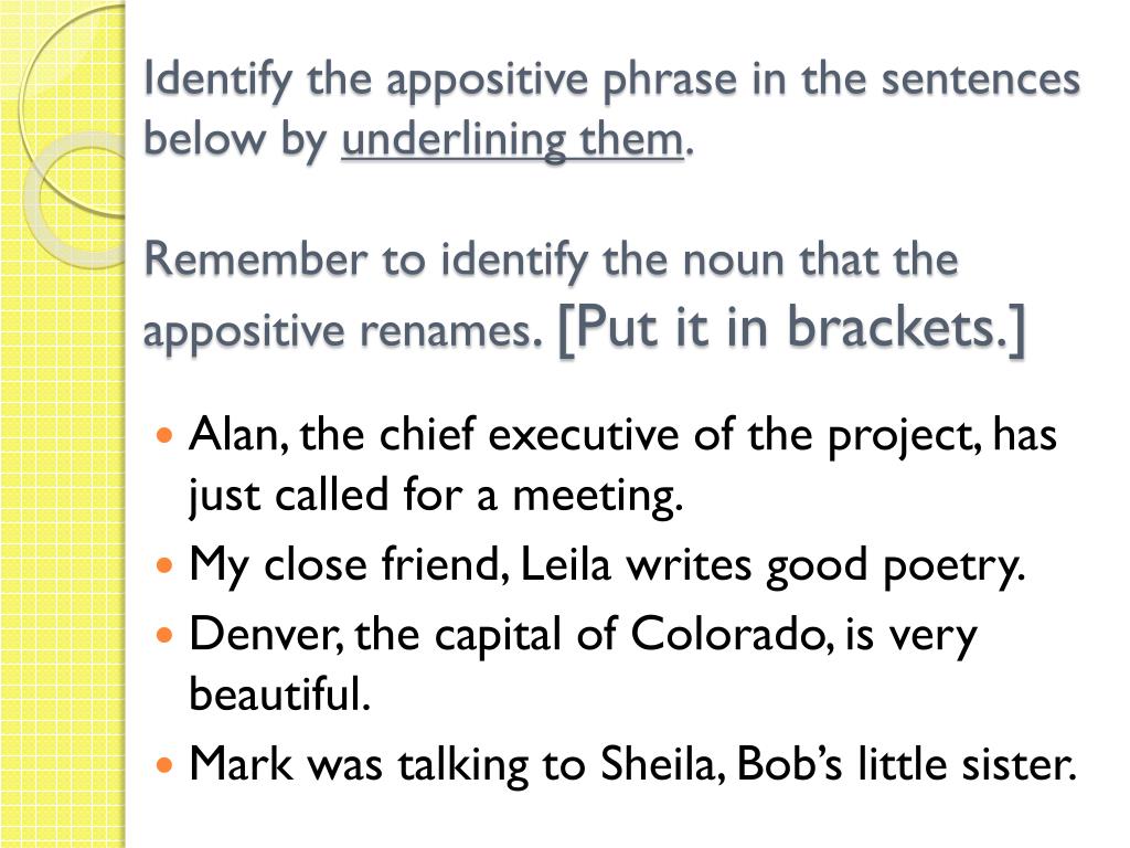Identify the appositive phrase in the sentences below by underlining them.Remember to identify the noun that the appositive renames. [Put it in brackets.] • Alan, the chief executive of the project, has just called for a meeting. • My close friend, Leila writes good poetry. • Denver, the capital of Colorado, is very beautiful. • Mark was talking to Sheila, Bob’s little sister.