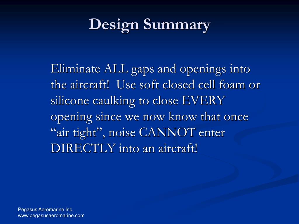 Design Summary Eliminate ALL gaps and openings into the aircraft! Use soft closed cell foam or silicone caulking to close EVERY opening since we now know that once “air tight”, noise CANNOT enter DIRECTLY into an aircraft!