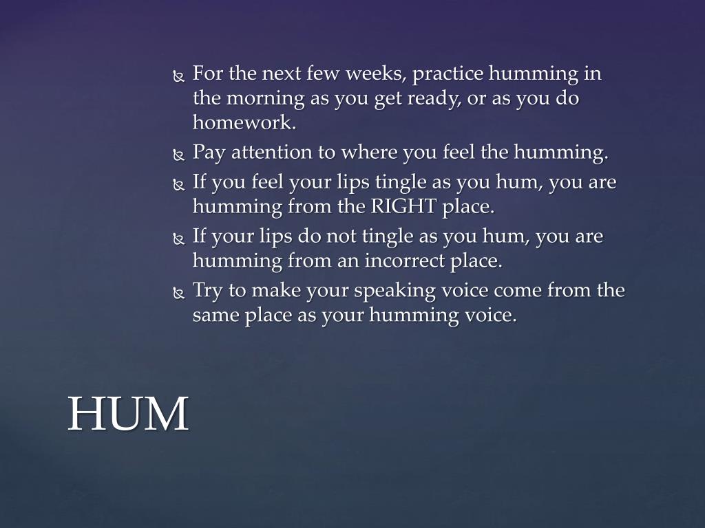 For the next few weeks, practice humming in the morning as you get ready, or as you do homework. • Pay attention to where you feel the humming. • If you feel your lips tingle as you hum, you are humming from the RIGHT place. • If your lips do not tingle as you hum, you are humming from an incorrect place. • Try to make your speaking voice come from the same place as your humming voice. HUM