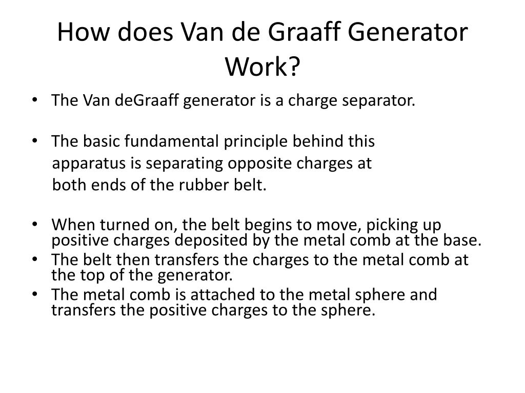 How does Van de Graaff Generator Work? • The Van deGraaff generator is a charge separator. • The basic fundamental principle behind this apparatus is separating opposite charges at both ends of the rubber belt. • When turned on, the belt begins to move, picking up positive charges deposited by the metal comb at the base. • The belt then transfers the charges to the metal comb at the top of the generator. • The metal comb is attached to the metal sphere and transfers the positive charges to the sphere.
