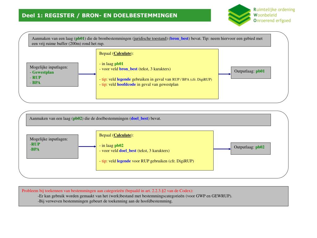 Deel 1: REGISTER / BRON- EN DOELBESTEMMINGEN Aanmaken van een laag (pb01) die de bronbestemmingen (juridische toestand) (bron_best) bevat. Tip: neem hiervoor een gebied met een vrij ruime buffer (200m) rond het rup. Bepaal (Calculate): - in laag pb01 - voor veld bron_best(tekst, 3 karakters) - tip: veld legende gebruiken in geval van RUP / BPA (cfr. DigiRUP) - tip: veld hoofdcode in geval van gewestplan • Mogelijke inputlagen: • - Gewestplan • RUP • BPA Outputlaag: pb01 Aanmaken van een laag (pb02) die de doelbestemmingen (doel_best) bevat. Bepaal (Calculate): - in laag pb02 - voor veld doel_best (tekst, 3 karakters) - tip: veld legende voor RUP gebruiken (cfr. DigiRUP) • Mogelijke inputlagen: • RUP • BPA Outputlaag: pb02 • Probleem bij toekennen van bestemmingen aan categorieën (bepaald in art. 2.2.3.§2 van de Codex): • Er kan gebruik worden gemaakt van het (werk)bestand met bestemmingscategorieën (voor GWP en GEWRUP). • Bij verweven bestemmingen gebeurt de toekenning aan de hoofdbestemming.