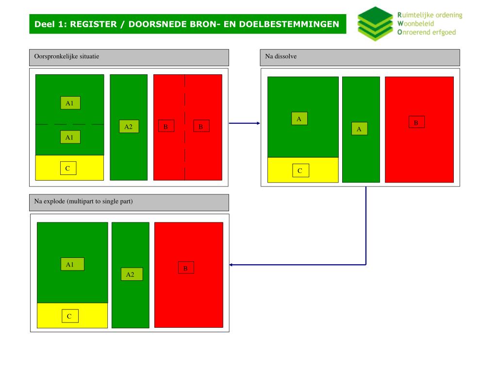 Deel 1: REGISTER / DOORSNEDE BRON- EN DOELBESTEMMINGEN Oorspronkelijke situatie Na dissolve A1 A B A2 B B A A1 C C Na explode (multipart to single part) A1 B A2 C