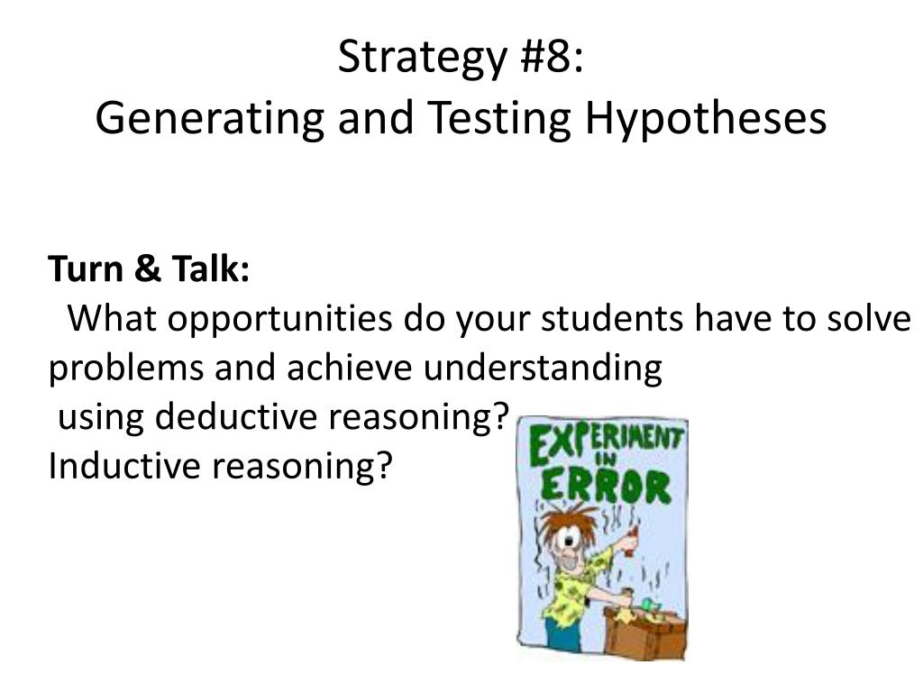Strategy #8: Generating and Testing Hypotheses Turn & Talk: What opportunities do your students have to solve problems and achieve understanding using deductive reasoning? Inductive reasoning?
