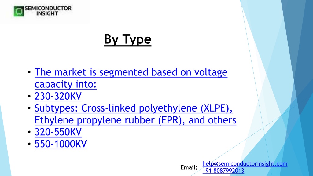 5. By Type • The market is segmented based on voltage capacity into: • 230-320KV • Subtypes: Cross-linked polyethylene (XLPE), Ethylene propylene rubber (EPR), and others • 320-550KV • 550-1000KV help@semiconductorinsight.com +91 8087992013 Email: