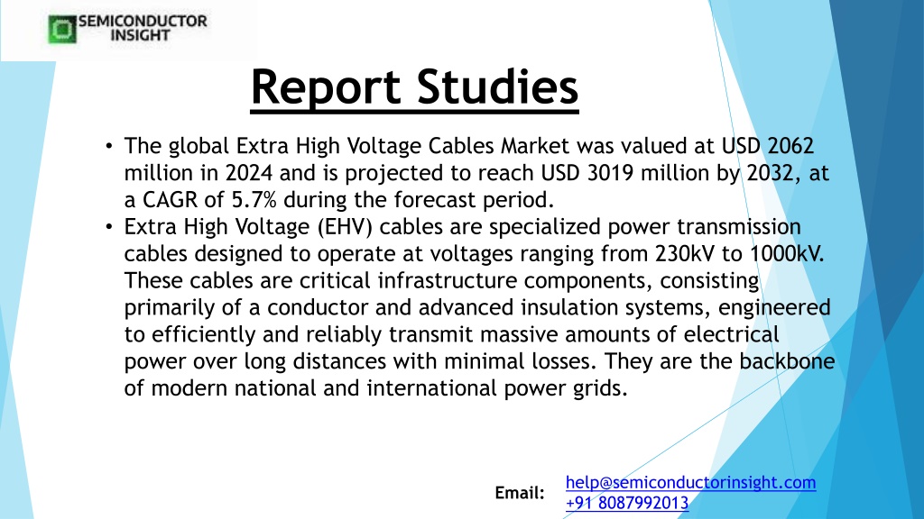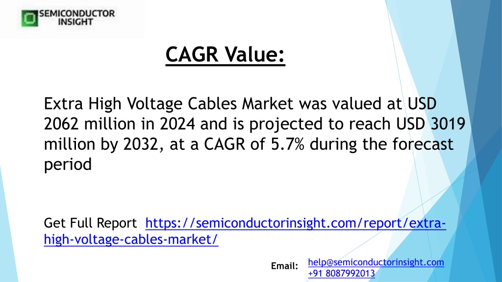 2. CAGR Value: Extra High Voltage Cables Market was valued at USD 2062 million in 2024 and is projected to reach USD 3019 million by 2032, at a CAGR of 5.7% during the forecast period Get Full Report https://semiconductorinsight.com/report/extra-high-voltage-cables-market/ help@semiconductorinsight.com +91 8087992013 Email: