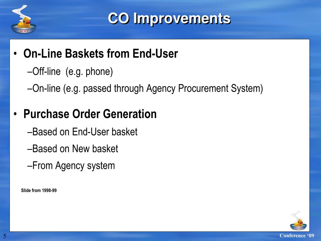 On-Line Baskets from End-User Off-line (e.g. phone) On-line (e.g. passed through Agency Procurement System) Purchase Order Generation Based on End-User basket Based on New basket From Agency system Slide from 1998-99 CO Improvements