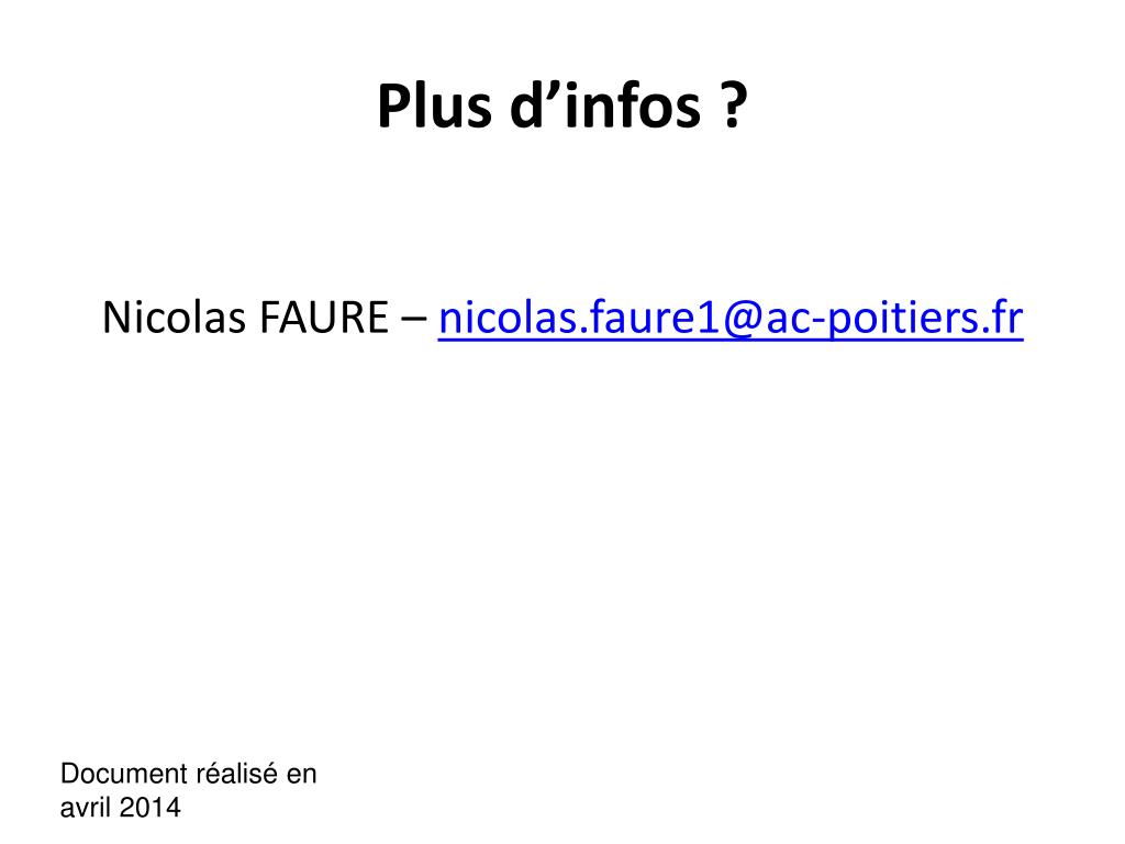 Plus d’infos ? Nicolas FAURE – nicolas.faure1@ac-poitiers.fr Document réalisé en avril 2014