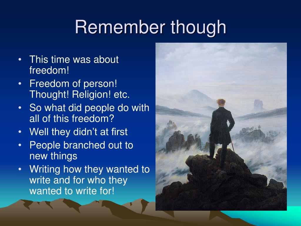 Remember though • This time was about freedom! • Freedom of person! Thought! Religion! etc. • So what did people do with all of this freedom? • Well they didn’t at first • People branched out to new things • Writing how they wanted to write and for who they wanted to write for!