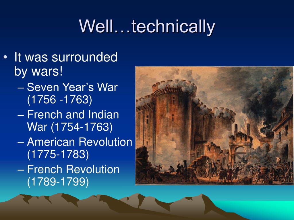 Well…technically • It was surrounded by wars! • Seven Year’s War (1756 -1763) • French and Indian War (1754-1763) • American Revolution (1775-1783) • French Revolution (1789-1799)