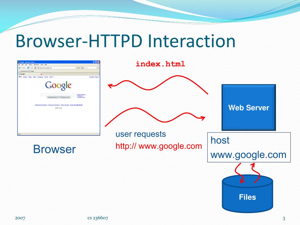 Browser-HTTPD Interaction index.html Web Server user requests http:// www.google.com host www.google.com Browser Files cs 236607