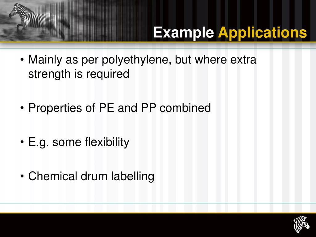 Example Applications • Mainly as per polyethylene, but where extra strength is required • Properties of PE and PP combined • E.g. some flexibility • Chemical drum labelling