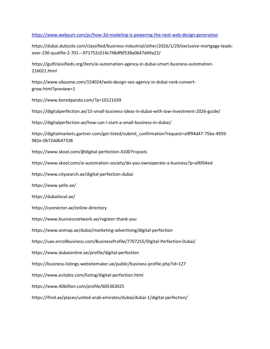 1. https://www.webyurt.com/pr/how-3d-modeling-is-powering-the-next-web-design-generation https://dubai.dubizzle.com/classified/business-industrial/other/2026/1/29/exclusive-mortgage-leads- over-230-qualifie-2-701---971752c014c748dfbf538a0647d49a22/ https://gulfclassifieds.org/item/ai-automation-agency-in-dubai-smart-business-automation- 216021.html https://www.obszone.com/154024/web-design-seo-agency-in-dubai-rank-convert- grow.html?preview=1 https://www.boredpanda.com/?p=10121039 https://digitalperfection.ae/15-small-business-ideas-in-dubai-with-low-investment-2026-guide/ https://digitalperfection.ae/how-can-i-start-a-small-business-in-dubai/ https://digitalmarkets.gartner.com/get-listed/submit_confirmation?request=a9f94d47-75ba-4959- 982e-0b72dd647338 https://www.skool.com/@digital-perfection-4100?t=posts https://www.skool.com/ai-automation-society/do-you-ownoperate-a-business?p=af6f04ed https://www.citysearch.ae/digital-perfection-dubai https://www.yello.ae/ https://dubailocal.ae/ https://connector.ae/online-directory https://www.businessnetwork.ae/register-thank-you https://www.onmap.ae/dubai/marketing-advertising/digital-perfection https://uae.enrollbusiness.com/BusinessProfile/7707255/Digital-Perfection-Dubai/ https://www.dubaionline.ae/profile/digital-perfection https://business-listings.websitemaker.ae/public/business-profile.php?id=127 https://www.ecitybiz.com/listing/digital-perfection.html https://www.40billion.com/profile/605363025 https://ifind.ae/places/united-arab-emirates/dubai/dubai-1/digital-perfection/