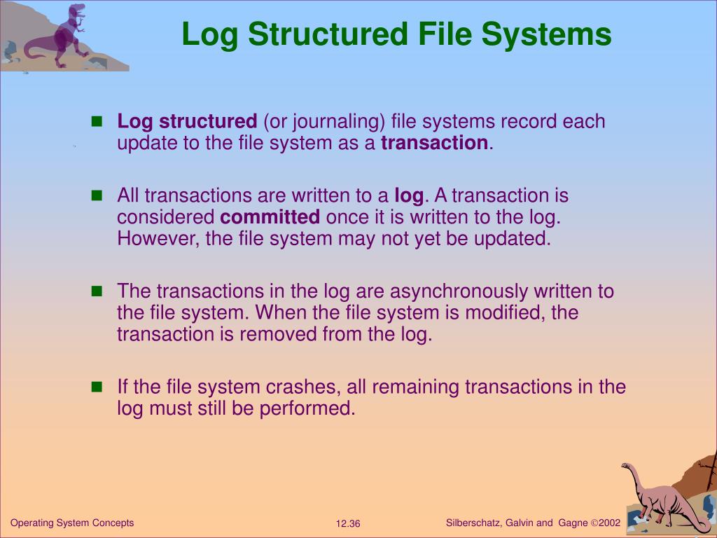 Log Structured File Systems • Log structured (or journaling) file systems record each update to the file system as a transaction. • All transactions are written to a log. A transaction is considered committed once it is written to the log. However, the file system may not yet be updated. • The transactions in the log are asynchronously written to the file system. When the file system is modified, the transaction is removed from the log. • If the file system crashes, all remaining transactions in the log must still be performed. Operating System Concepts