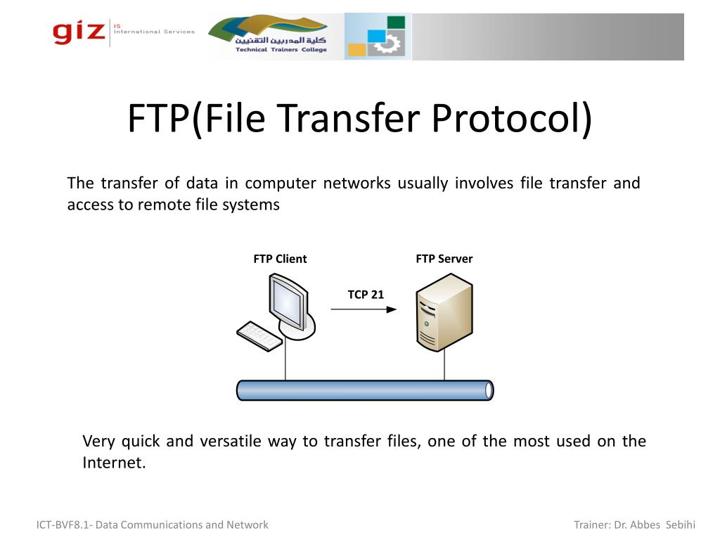FTP(File Transfer Protocol) The transfer of data in computer networks usually involves file transfer and access to remote file systems Very quick and versatile way to transfer files, one of the most used on the Internet. ICT-BVF8.1- Data Communications and Network Trainer: Dr. Abbes Sebihi